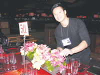 現(xiàn)年36歲的Vinnie Bui,今年是第1次參與慶功宴的花藝設(shè)計(jì)。Vinnie說整個(gè)設(shè)計(jì)的概念,就是先把蘚苔放在長(zhǎng)方形的盤子里,然后在上面插上綠色和紫紅色的蘭花,呈現(xiàn)強(qiáng)烈和亮麗的對(duì)比。這個(gè)布局完成后,他們便會(huì)將盤子放在桌面上一個(gè)長(zhǎng)方鐵架,再在盤子兩邊分別插入一條彎彎的垂莧菜,并于垂莧菜末端擺上一塊精致可愛的肉質(zhì)仙人掌,帶出優(yōu)雅線條的品味。