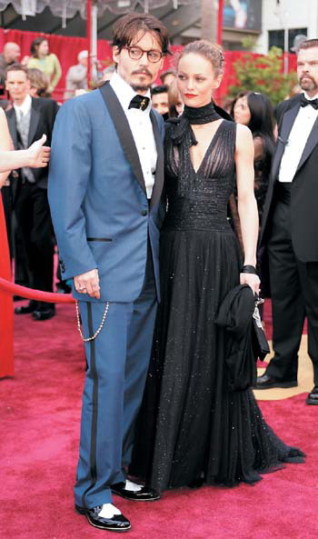 性格男星約翰尼·德普在著裝方面,向來(lái)不走尋常路。這回他不但又另類(lèi)了一把,還將女友也“拉下水”。德普穿了身明藍(lán)色的西裝,墨黑色的領(lǐng)結(jié)上,還繡了暗黃色的圖案;西裝內(nèi)的白色襯衣倒還中規(guī)中矩;他的腰間吊了條金色的掛件;最吸引人眼球的還屬德普腳下那雙黑白兩色的皮鞋,特別是鞋頭的圖案,竟是個(gè)大大的白色桃心,整個(gè)怪異的裝束,配上德普冷漠詭異的神情,活脫脫一副僵尸派頭,簡(jiǎn)直賺足了噱頭。