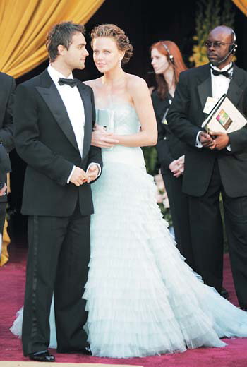 上屆影后查理茲·塞隆的著裝,遠(yuǎn)比去年她拿獎(jiǎng)時(shí)的那身出彩,淡青色的雪紡料長(zhǎng)裙,既貼身又下垂,正好將她曼妙的身材凸顯得玲瓏有致;低胸的設(shè)計(jì),再配上同色的薄紗做點(diǎn)綴,顯得明快生動(dòng);裙的下部是層層擴(kuò)大的荷邊式下擺,裙尾略有拖地,恰到好處地彌補(bǔ)了塞隆腰短的缺點(diǎn),空靈飄逸,幽雅高貴,整體效果非常出眾。