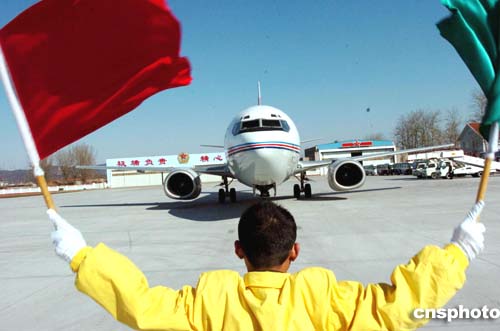 圖為北京西郊機場地勤工作人員引導安徽省代表團所乘飛機進入停機坪。作者:陳文