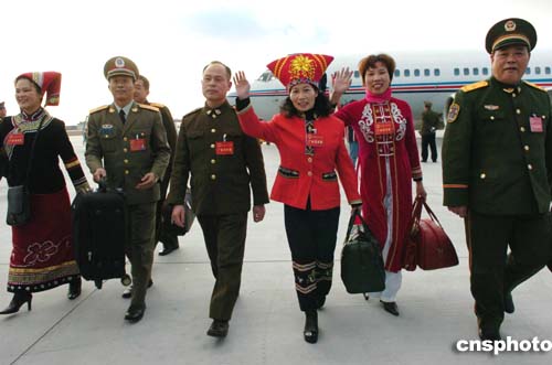三月二日,參加十屆全國人大三次會議的各地人大代表陸續(xù)抵達(dá)北京,圖為來自廣西的少數(shù)民族代表與軍隊(duì)代表一起走出北京西郊機(jī)場。作者:陳文