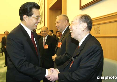 全國(guó)政協(xié)十屆三次會(huì)議三月三日在北京開幕,國(guó)家主席胡錦濤在開幕式前問候出席會(huì)議的全國(guó)政協(xié)副主席馬萬祺。作者:廖文靜