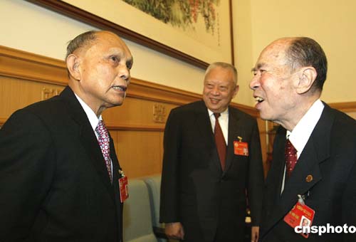 全國政協(xié)十屆三次會議三月三日在北京開幕,全國政協(xié)副主席霍英東、馬萬祺與香港特首董建華在出席大會時互致問候。作者:廖文靜
