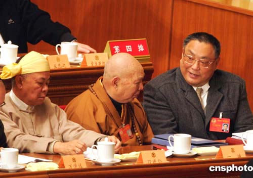 全國(guó)政協(xié)十屆三次會(huì)議三月三日在北京人民大會(huì)堂舉行,中國(guó)殘聯(lián)主席鄧樸方(右)出席大會(huì)時(shí)與其他委員交談。作者:湯彥俊