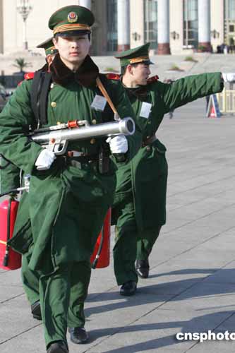 圖:武警消防官兵巡視天安門廣場