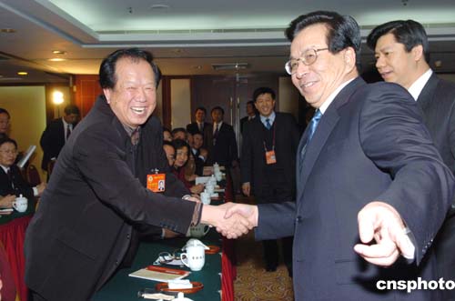 三月四日,中共中央政治局常委、國家副主席曾慶紅到北京華潤飯店參加全國政協(xié)民進、民盟聯(lián)組會議時,應(yīng)著名導演李前寬的要求與其握手。作者:陳文