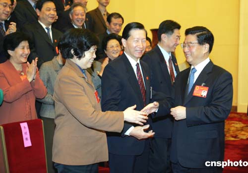 中共中央政治局常委、國務(wù)院副總理黃菊,三月六日到全國人大上海代表團和代表們一起審議政府工作報告。作者:湯彥俊