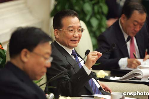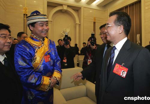 國務院總理溫家寶三月五日下午與出席十屆全國人大三次會議的甘肅代表一起審議政府工作報告。作者:毛建軍