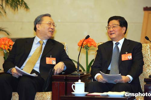 中共中央政治局常委、國務(wù)院副總理黃菊,三月七日到全國人大遼寧代表團(tuán)和代表們一起審議政府工作報(bào)告。圖為黃菊聽取全國人大常委會(huì)副委員長、中國科學(xué)院院長路甬祥發(fā)言。作者:湯彥俊