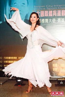 昨晚于臺(tái)師大分部舉行的“2005臺(tái)北國際標(biāo)準(zhǔn)舞大賽”,邀請中國、丹麥等舞林高手飆舞。劉真特地以一身雪白舞衣,擔(dān)任“國標(biāo)舞大使”唐誠精采舞姿介紹人,她說:“唐誠67歲才開始學(xué)舞,我會(huì)有今天這成就,受唐誠影響很深!