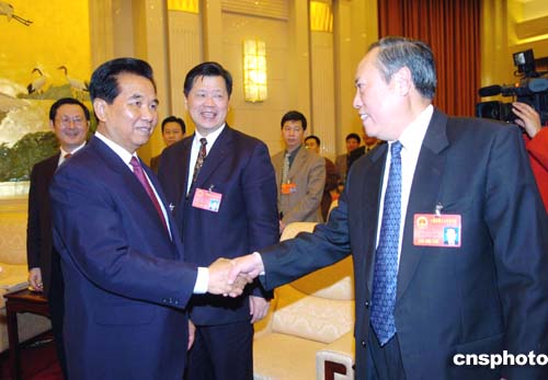 中共中央政治局常委吳官正三月七日到全國人大黑龍江代表團(tuán)與代表們一起審議溫家寶總理所作的政府工作報告。作者:陳文