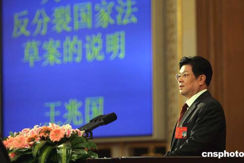 王兆國(guó)表示,這里需要強(qiáng)調(diào),如果“臺(tái)獨(dú)”分裂勢(shì)力一意孤行,迫使我們不得不作出最后選擇,采取非和平方式及其它必要措施,完全是針對(duì)“臺(tái)獨(dú)”分裂勢(shì)力的,決不是針對(duì)臺(tái)灣同胞的。草案明確規(guī)定,依照本法規(guī)定采取非和平方式及其它必要措施并組織實(shí)施時(shí),國(guó)家盡最大可能保護(hù)臺(tái)灣平民和在臺(tái)灣的外國(guó)人的生命財(cái)產(chǎn)安全和其它正當(dāng)權(quán)益,減少損失﹔同時(shí),國(guó)家依法保護(hù)臺(tái)灣同胞在中國(guó)其它地區(qū)的權(quán)利和利益。