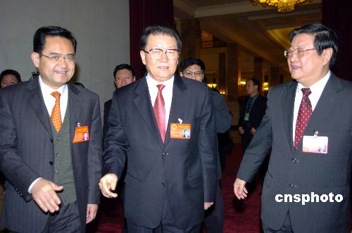 中共中央政治局常委李長(zhǎng)春三月八日到全國(guó)人大河北代表團(tuán),與代表們一起審議《反分裂國(guó)家法(草案)》。圖為李長(zhǎng)春與河北省委書記白克明(右)等交談。作者:陳文