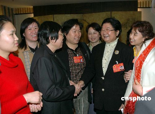 圖:顧秀蓮到山東團(tuán)向女代表祝賀節(jié)日