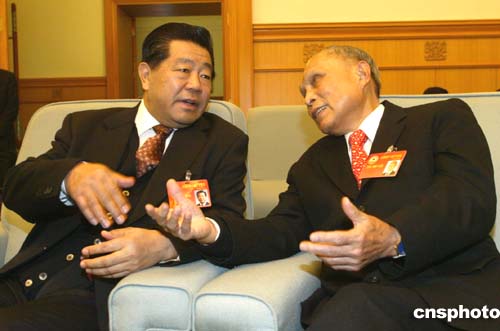 全國政協(xié)十屆三次會(huì)議第三次全體大會(huì)三月九日在北京人民大會(huì)堂舉行。全國政協(xié)主席賈慶林與副主席霍英東在會(huì)前交談。作者:廖文靜