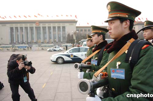 三月九日,一位采訪“兩會(huì)”的攝影記者在天安門廣場(chǎng)拍攝值勤的武警戰(zhàn)士。作者:陳文