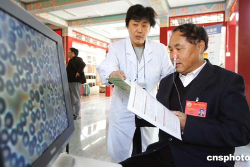 全國政協(xié)十屆三次會議三月十一日下午休會半天,圖為醫(yī)務(wù)人員在友誼賓館駐地為參會的委員們做免費健康咨詢。作者:湯彥俊