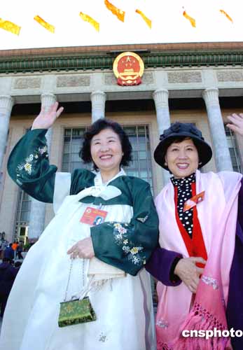 三月十二日下午,全國政協(xié)十屆三次會議在北京人民大會堂閉幕,全國政協(xié)委員樸惠善(左)、李承淑(右)愉快地走出會場。作者:陳文