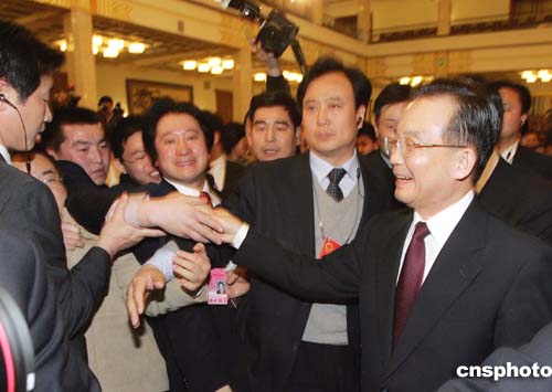 十屆全國人大三次會議三月十四日在北京人民大會堂閉幕,國務院總理溫家寶在閉幕會后舉行記者會。圖為溫總理在記者招待會結(jié)束后走到記者席前,與現(xiàn)場采訪的中外記者握手。作者:毛建軍