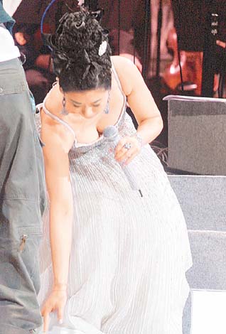 而沙麗則以高貴宮廷貴婦造型亮相,她身穿性感的白色低胸吊帶裙,披了小外套,襯以高髻發(fā)型,并佩戴閃令令的鉆石耳環(huán)及戒指,貴氣十足,但沙麗自嘲發(fā)型似菠蘿頭.之后沙麗問歌迷介不介意她脫去外套?然后指揮家便替沙麗除去外套,沙麗說:“今晚不跳舞,不會有危險.今晚我買了保險,如果像我老公一樣跌傷也會有錢賠!