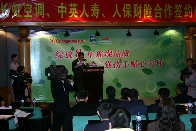 四川長虹電器股份有限公司黨委書記、副董事長劉體斌、中英人壽成都分公司總經(jīng)理吳傳成、人保財(cái)險(xiǎn)四川省分公司副總經(jīng)理常川參加了簽字儀式,長虹空調(diào)公司總經(jīng)理李進(jìn)博士、中英人壽助理總裁常穎、長虹空調(diào)(中國)營銷公司市場推廣部部長余皓就雙方產(chǎn)品及聯(lián)合營銷事宜向新聞媒體作了介紹。