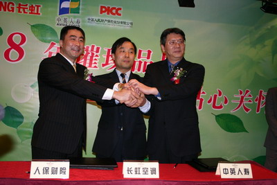 中新四川網(wǎng)3月19日電(記者楊杰)長虹空調(diào)、中英人壽、人保財(cái)險(xiǎn)今天上午在成都假日酒店舉行簽約儀式暨新聞發(fā)布會(huì),首次以三大巨頭聯(lián)手的形式,推出“買長虹精品空調(diào)、送十五萬保險(xiǎn)”的活動(dòng),真情回饋消費(fèi)者。