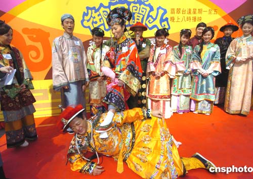 正在香港黃金時段播出的電視劇《御用閑人》劇中演員身著戲裝19日來到尖沙咀鬧市區(qū)演戲﹐為該劇播出進(jìn)行宣傳造勢。作者:趙振清