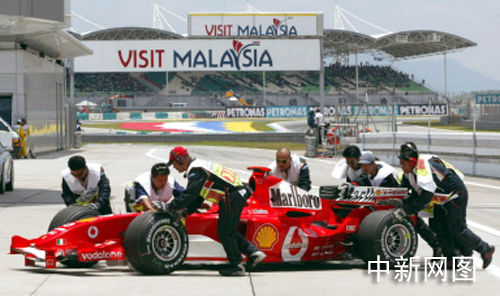 2005年3月19日,邁克爾-舒馬赫在馬來(lái)西亞雪邦賽道完成“F1馬來(lái)西亞大獎(jiǎng)賽”首輪排位賽后,賽場(chǎng)官員將他的法拉利賽車推到車庫(kù)進(jìn)行檢查。當(dāng)天,西班牙車手費(fèi)爾南多-阿隆索以1小時(shí)32分582位居排位賽首位,豐田車隊(duì)的意大利車手亞諾-特魯利以及他的意大利隊(duì)友吉安卡諾-費(fèi)斯切拉緊隨其后。
