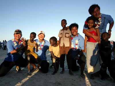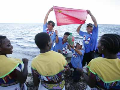當(dāng)?shù)貢r(shí)間十九日晚,肯尼亞的專業(yè)合唱團(tuán)體以及少兒演員載歌載舞歡聚一堂,在蒙巴薩白沙海灘,以獨(dú)特的非洲風(fēng)情歌舞,盛迎抵達(dá)蒙巴薩的“鳳凰號(hào)”,以及前來迎接鳳凰號(hào)的中國客人?夏醽喓铣獔F(tuán)用中文演唱的中國民歌《在那遙遠(yuǎn)的地方》博得全場(chǎng)熱烈掌聲。美麗的“二OO四肯尼亞小姐”朱麗葉、在肯留華校友會(huì)主席哪吒先生,與鳳凰衛(wèi)視主持人竇文濤和陳魯豫共同主持了晚會(huì)。完