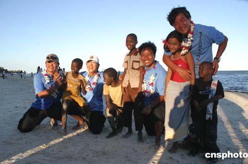 香港鳳凰衛(wèi)視“鳳凰號(hào)”單桅帆船完成鄭和下西洋航程十六日抵達(dá)肯尼亞蒙巴薩港,圖為“鳳凰號(hào)”隊(duì)員們十九日與肯尼亞兒童在一起。作者:邢健