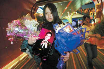 雖然張國榮已經(jīng)離開了近兩年,但是他的影迷卻一直沒有忘記他。昨天,當(dāng)記者來到影片《異度空間》首映式現(xiàn)場時發(fā)現(xiàn),現(xiàn)場已經(jīng)聚集了上百位張國榮的影迷,在影片海報旁擺滿了他們送來的白玫瑰和白百合,上面還插著“哥哥”的生前照片。而影院也配合播放著張國榮的歌曲,很多歌迷也在小聲地隨著哼唱。
