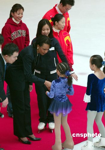 美國國務(wù)卿賴斯三月二十一日在北京與中國花樣滑冰愛好者親切交流,中國著名雙人滑選手申雪、趙宏博、冬季奧運(yùn)會(huì)金牌選手楊陽等陪同出席活動(dòng)。作者:滿會(huì)喬