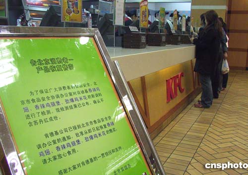 三月二十二日,北京市民在肯德基王府井店內(nèi)購(gòu)買食品。三天前停止售賣的肯德基香辣雞腿漢堡、香辣雞翅、勁爆雞米花當(dāng)天重新上市?系禄l(fā)布店堂告示,稱這三種產(chǎn)品經(jīng)北京食品安全協(xié)調(diào)辦公室檢驗(yàn)復(fù)查不含蘇丹紅,于二十二日正式恢復(fù)銷售。作者:韓藝冰