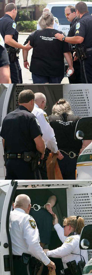 圖為當(dāng)?shù)厥ジダ饰魉故刑熘鹘坦ぷ魅藛T賈科布被佛羅里達(dá)州警方以“非法侵入他人領(lǐng)地”罪逮捕。賈科布試圖偷偷將一瓶水帶給植物人夏沃。(固山)