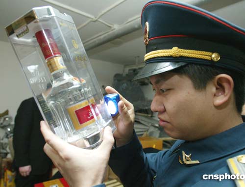| 今年頭兩個多月的時間內(nèi),北京工商東城分局共查獲各種名牌假白酒1792瓶,案值12.8萬元人民幣。其中絕大多數(shù)酒瓶和包裝箱均為回收品,特別是部分假冒名牌酒,均使用舊酒瓶及包裝。由于這些假酒使用的是回收舊瓶,普通消費者很難識別。如何銷毀舊酒瓶,杜絕不在回收二次使用,成為打擊假名酒的“關(guān)鍵”。圖為東城工商分局執(zhí)法人員在仔細檢查酒瓶的外觀。作者:羅偉