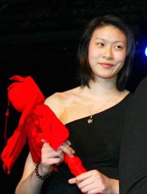 一襲黑色長(zhǎng)裙,露出半邊肩膀,是好萊塢剛流行過(guò)的式樣。趙蕊蕊顯然是無(wú)法習(xí)慣這樣性感的裝束,羞答答地上了臺(tái)。直到迎上帥哥索普贊許的眼神,更是露出一臉羞澀的笑容!斑真不習(xí)慣這樣穿,別扭極了!闭f(shuō)話聲音一如平時(shí)的爽朗,“還是運(yùn)動(dòng)衣更符合我的氣質(zhì)!边@樣的曳地長(zhǎng)裙,還會(huì)再穿么?“也許不會(huì)了吧。”