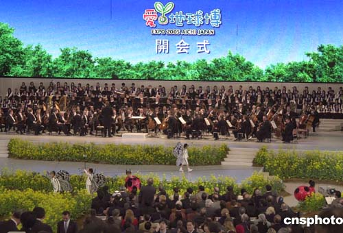 世博會(huì)場(chǎng)的活動(dòng)禮堂——“世博巨蛋”今天聚集了兩千多人,日本明仁天皇和皇后、皇太子德仁、日本首相小泉純一郎等日本要人均與會(huì)。會(huì)場(chǎng)各處布滿金黃色菜花,裝扮成各種昆蟲(chóng)的孩童來(lái)回奔走,整個(gè)會(huì)場(chǎng),包括桌椅皆以廢物利用技術(shù)制成,強(qiáng)調(diào)人與自然和諧相處,本次世博會(huì)的環(huán)保主題由此不言而喻。