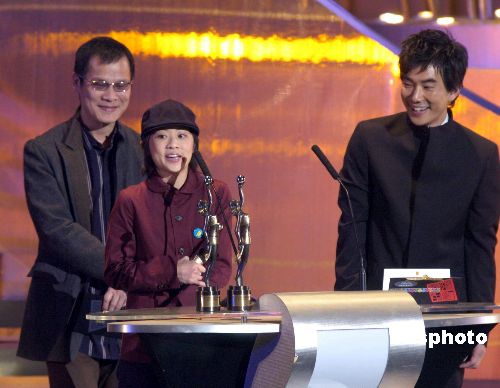 “第廿四屆香港電影金像獎頒獎典禮”3月27日晚于“紅館”舉行,來港的嘉賓羅大佑、任賢齊為獲得最佳原創(chuàng)電影歌曲獎的The Pancakes頒獎。作者:洪少葵