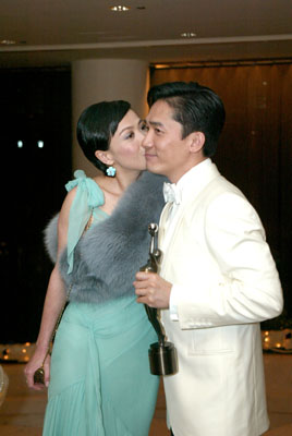 “偉仔”與嘉玲在頒獎(jiǎng)禮結(jié)束不久即抵達(dá)慶功宴會(huì)場(chǎng),五度稱帝的他一直面露笑容,上臺(tái)領(lǐng)獎(jiǎng)時(shí)的緊張一掃而空,嘉玲更即場(chǎng)吻賀男友!皞プ小苯忉,他上臺(tái)時(shí)的心情就好像第一次拿獎(jiǎng)一樣緊張,因他已因?yàn)椤痘幽耆A》里的周慕云而奪得影帝,今次在《2046》里再演同一個(gè)角色,要能夠拿兩次獎(jiǎng),難度非常高。因此,他對(duì)獲獎(jiǎng)感到十分開心,但同時(shí)又承認(rèn)并不覺得太意外,因他之前已憑《2046》奪得香港電影評(píng)論學(xué)會(huì)的“最佳男演員”獎(jiǎng),自然也想再在金像獎(jiǎng)得獎(jiǎng)。對(duì)于成為五屆影帝,他只以“好彩”來(lái)形容,說(shuō)自己運(yùn)氣好,王家衛(wèi)“腳頭”也好。另外,出爐影后章子怡繼續(xù)其“少話”本色,慶功宴上仍來(lái)去匆匆,不肯多談感受,只表示很開心,已經(jīng)即時(shí)致電家人及朋友報(bào)喜。