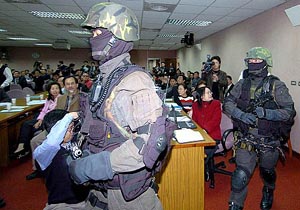 中新網(wǎng)3月30日電 為了說(shuō)明反恐現(xiàn)況,臺(tái)“立法院國(guó)防委員會(huì)”特地找了全副武裝的軍警特種部隊(duì)人員到現(xiàn)場(chǎng)解說(shuō)。帶槍進(jìn)“立法院”實(shí)在敏感,讓不少“立委”瞠目結(jié)舌。