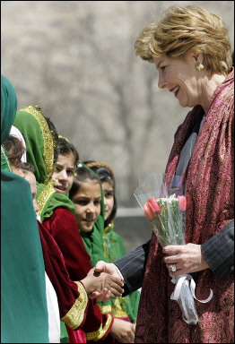 在勞拉訪問阿富汗期間,美國教育部長瑪格麗特·斯拜林斯一直在其左右陪同。