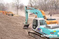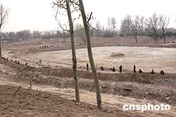 | 中國國家環(huán)?偩秩涨奥暶,圓明園湖底鋪設(shè)防滲膜工程至今未進行建設(shè)項目環(huán)境影響評價,應(yīng)該立即停止建設(shè),充分征詢社會各界的意見,依法補辦環(huán)境影響評價審批手續(xù)。三月三十一日,投資1億元,持續(xù)數(shù)個月的2000余畝圓明園湖底(鋪塑料)防滲水工程開始停工。圖為圓明園福海西側(cè)一角藏龍臥虎,大型機械余熱方盡。但是,圓明園三園(包括長春園、綺春園),約2000余畝湖底防滲工程已基本鋪設(shè)完成了防滲水塑料,令專家和百姓失望。作者:鄒憲