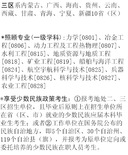 二、體現(xiàn)了統(tǒng)籌兼顧、協(xié)調(diào)發(fā)展的原則。根據(jù)我國(guó)東西部地區(qū)經(jīng)濟(jì)、教育發(fā)展不平衡的現(xiàn)實(shí)狀況,對(duì)報(bào)考西部地區(qū)和少數(shù)民族地區(qū)的考生以及少數(shù)民族考生采取適度照顧的政策。對(duì)礦業(yè)、地質(zhì)等11個(gè)艱苦專業(yè)繼續(xù)采取適當(dāng)照顧政策。