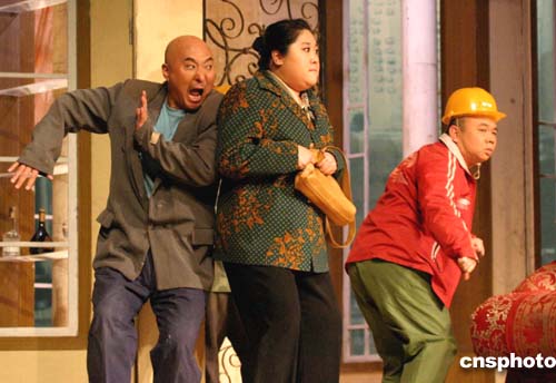 三月三十一日晚,中國內(nèi)地著名喜劇明星陳佩斯“舞臺喜劇三部曲”的最后一部《陽臺》在北京上演。陳佩斯(左)在《陽臺》里扮演的是包工頭老穆。舞臺上的民工形象格外生動逼真。頭戴安全帽、身穿迷彩服、拿著喇叭大喊的民工形象堪稱一絕。作者:張勤