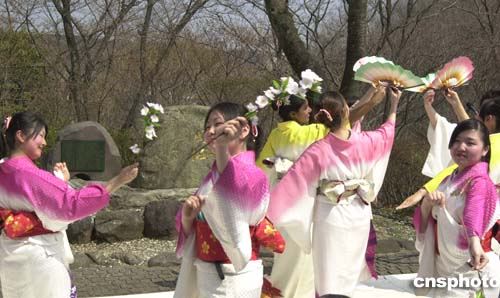 | 日本創(chuàng)價大學校園內(nèi)三日舉行傳統(tǒng)的“周櫻”觀賞會。三十年前,在創(chuàng)價學會會長池田大作的提議下,首批留學創(chuàng)價大學的六名中國留學生種植櫻花樹苗,被命名為“周櫻”。此后,每年春暖花開時節(jié)的“周櫻”觀賞會,便成為此間日本友人緬懷周恩來的一項傳統(tǒng)活動。圖為在“周櫻”紀念碑前,創(chuàng)價大學學生手持櫻花翩翩起舞。作者:王健
