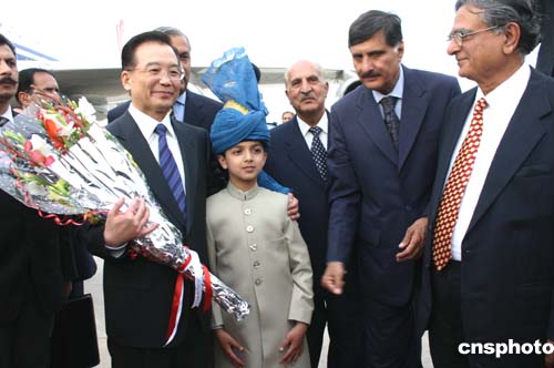 中國國務(wù)院總理溫家寶傍晚抵達伊斯蘭堡空軍機場,開始對巴基斯坦進行為期三天的正式訪問。圖為溫家寶與給他獻花的巴基斯坦少年親切合影。