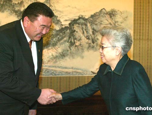 中國(guó)國(guó)務(wù)院副總理吳儀四月七日在北京會(huì)見蒙古交通運(yùn)輸旅游部長(zhǎng)、中蒙經(jīng)貿(mào)聯(lián)委會(huì)蒙方主席巴特呼。作者:滿會(huì)喬