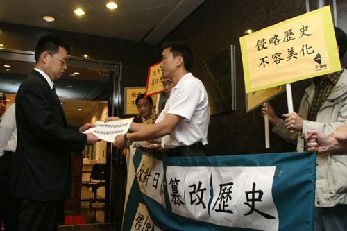 各社會(huì)團(tuán)體強(qiáng)烈要求日本政府盡快修正被篡改的歷史教科書,停止所有軍事擴(kuò)張的行徑,放棄一切有軍國主義色彩的活動(dòng),停止縱容國內(nèi)的右翼分子,并就二次世界大戰(zhàn)中的罪行作出公開道歉和賠償。