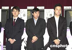 第十八屆富士通杯世界圍棋錦標(biāo)賽四月十一日在日本棋院戰(zhàn)罷第二輪。三名中國棋手全線告捷,戰(zhàn)勝各自對手進(jìn)入八強(qiáng)。其中古力七段(圖右)中盤戰(zhàn)勝韓國棋手李昌鎬九段;俞斌九段(圖中)以三目半戰(zhàn)勝中國臺(tái)北周俊勛九段;王檄五段(圖左)中盤勝日本羽根直樹九段。圖為三名獲勝的中國棋手賽后與現(xiàn)場觀眾見面,并進(jìn)行下一輪對陣位置的抽選。作者:王健