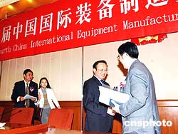 四月十二日,第四屆中國國際裝備制造業(yè)博覽會(huì)在北京人民大會(huì)堂舉行新聞發(fā)布會(huì),中國商務(wù)部副部長魏建國(右二)、遼寧省副省長李萬才(右一)分別介紹中國機(jī)電產(chǎn)品進(jìn)出口和展覽會(huì)籌備情況。第四屆中國國際裝備制造業(yè)博覽會(huì)將于八月三十日在沈陽舉行。作者:王麗南